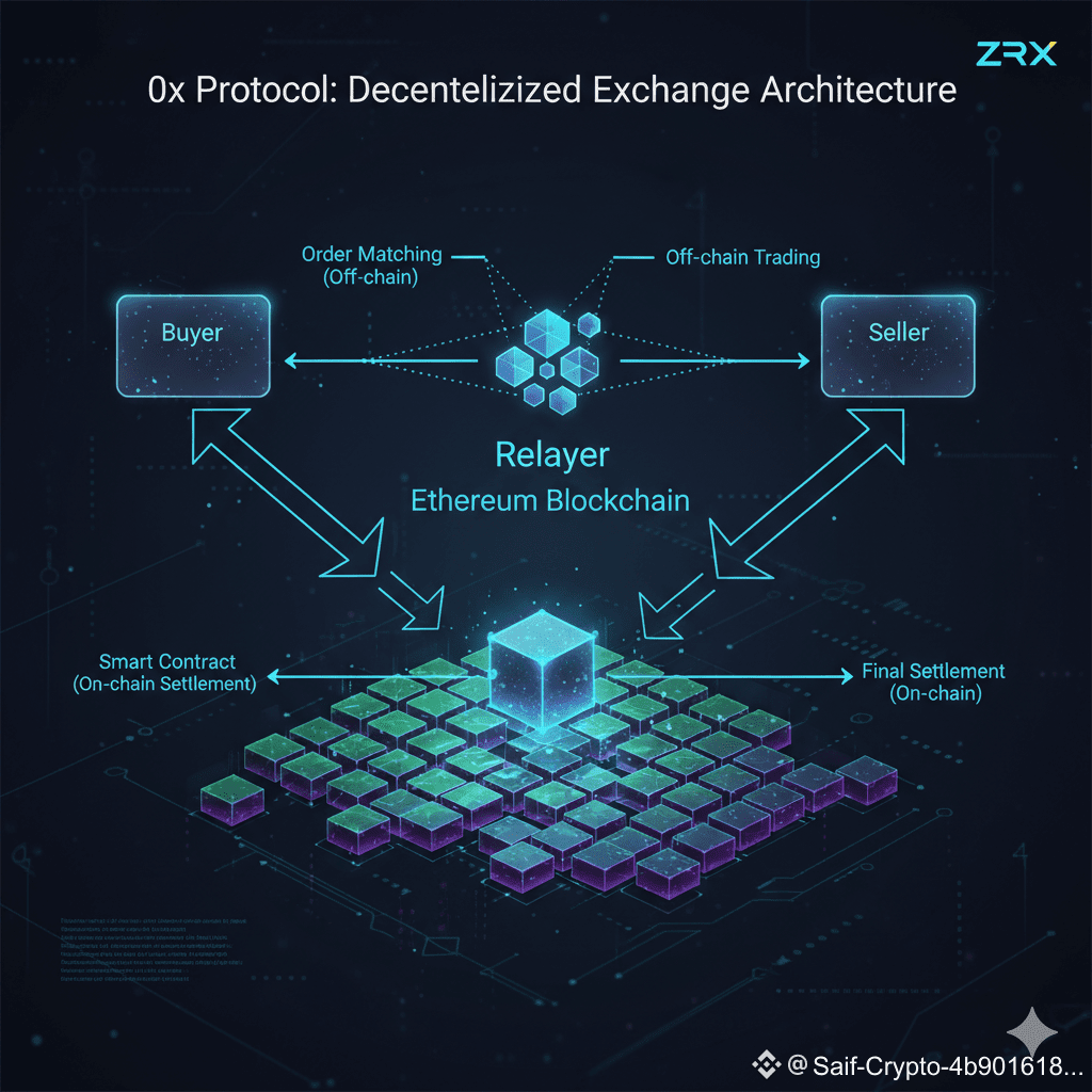 يستخدم 0x ما يُعرف باسم Relayers، وهم بمثابة وسطاء يقومون بتسهيل العثور على الصفقات بين المشترين والبائعين، لكن التسوية النهائية تتم مباشرة على البلوكشين عبر العقود الذكية.