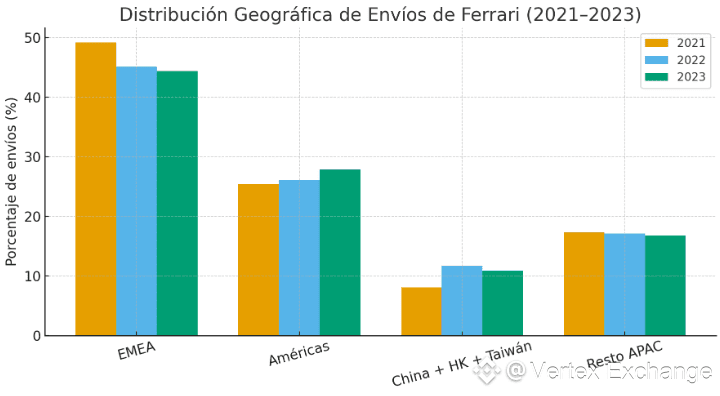 • Volumen (Estructural): Ferrari sigue una estrategia de crecimiento de envíos controlado y gradual para proteger la exclusividad. El volumen aumentó de 11,155 unidades en 2021 a 13,663 en 2023.