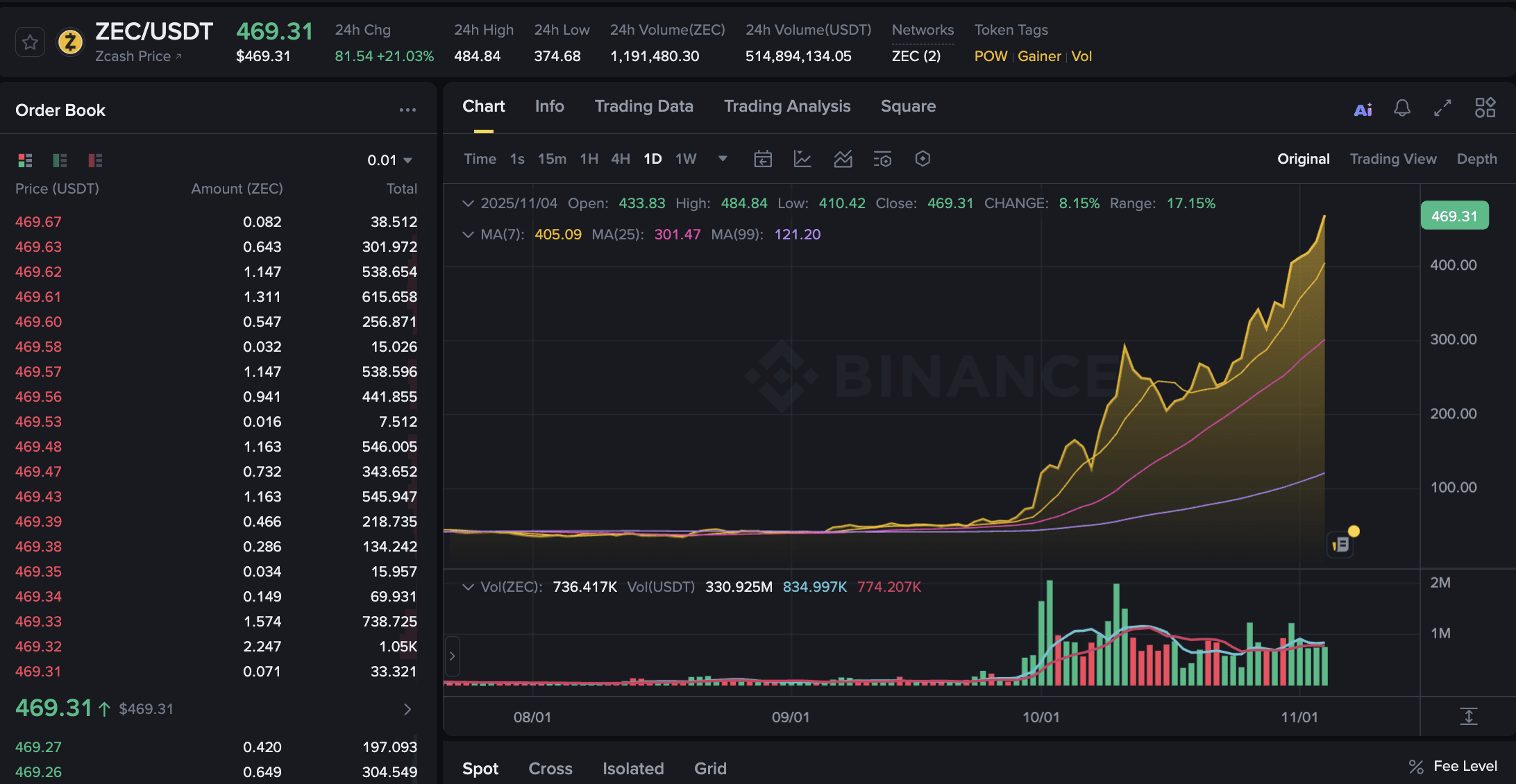 Zcash (ZEC) поднимается на 21% до $469, что поднимает общую рыночную капитализацию монет с приватностью выше $25 миллиардов