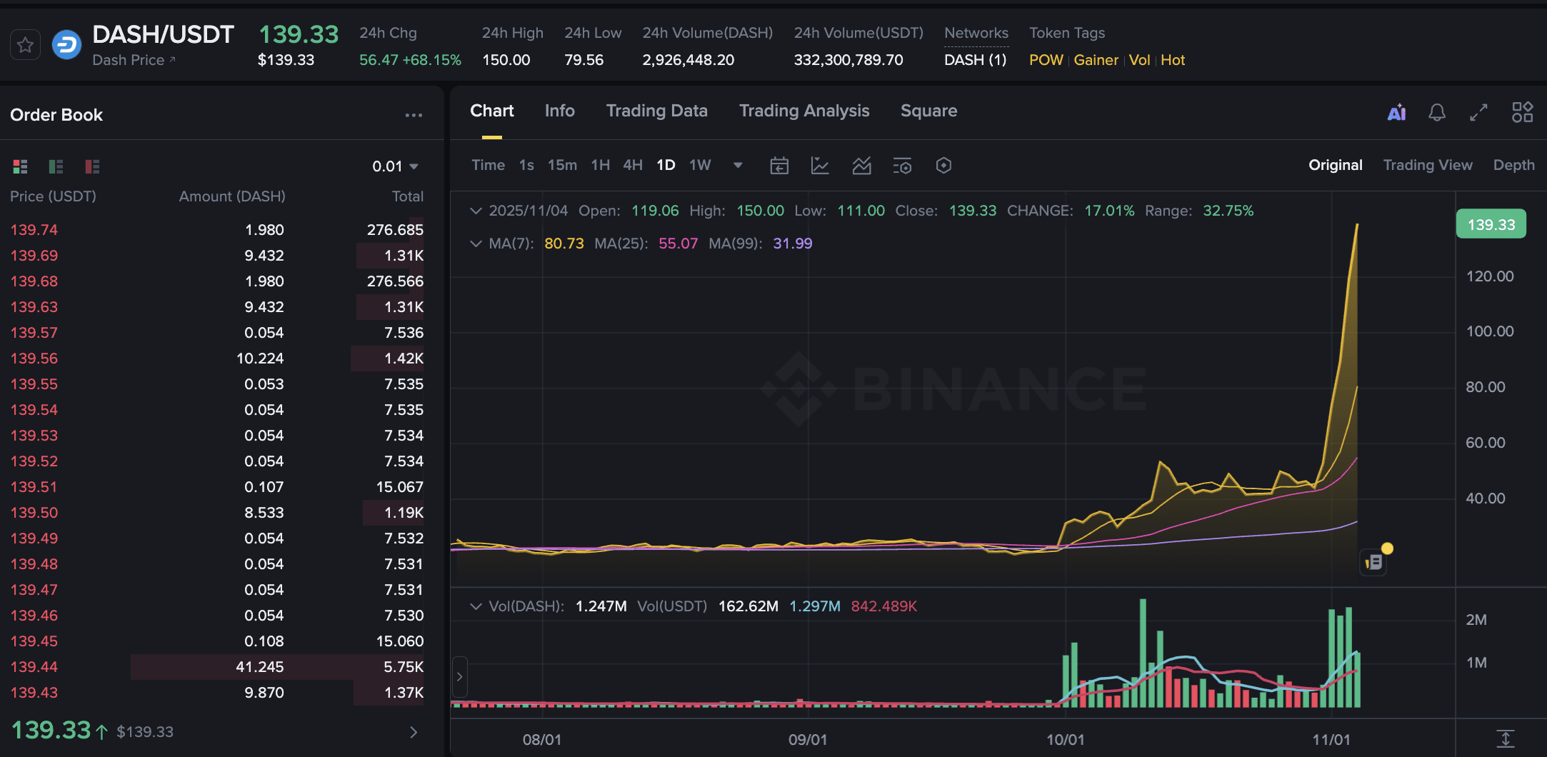 Монеты с приватностью взлетают, при этом DASH поднимается на 66% до $138.32, возглавляя бычий момент сектора