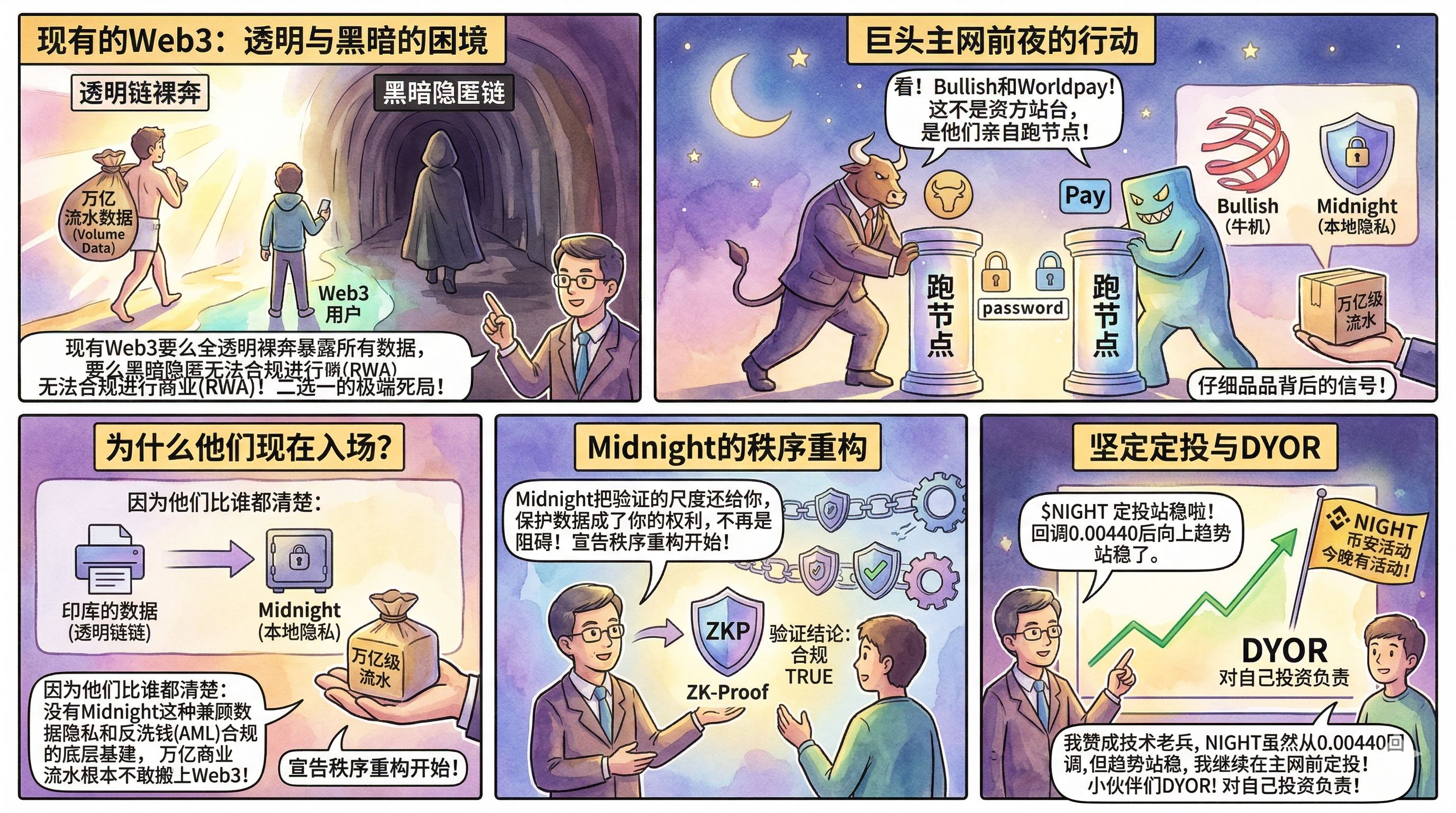 Я прекрасно понимаю, что для поддержки такого перехода бизнес-парадигмы недостаточно лишь технологий, нужен также экономический двигатель. Вот почему я особенно оптимистично настроен на модель двойного токена $NIGHT и DUST. Публичный $NIGHT обеспечивает долгосрочную безопасность сети, а автоматически генерируемый, ненадежный DUST стал моим эксклюзивным топливом для "доказательства возможностей". Я обнаружил, что этот дизайн не только перекрыл возможность отмывания денег в сером и черном секторах, но и позволил мне и компаниям превратить "не раскрываясь, можно вести дела" в стандартный опыт повседневного бизнеса с очень низкими затратами на определенность.