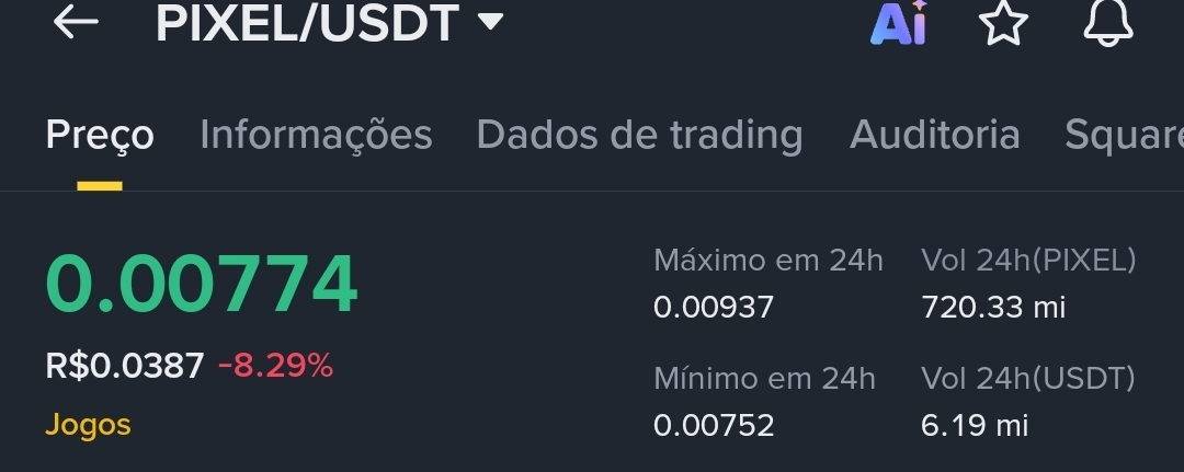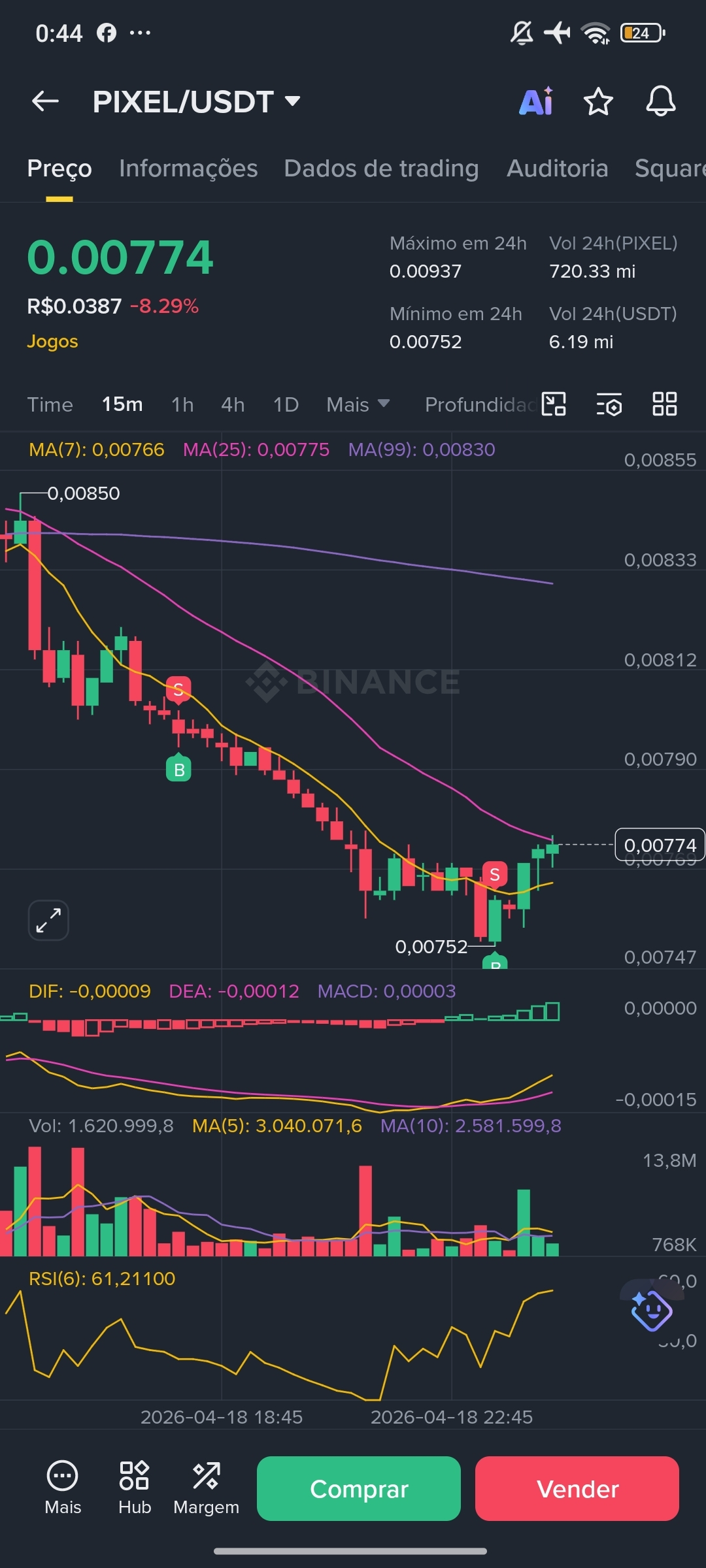 Abri o gráfico agora: $0.00774, mínimo tocou $0.00752 com volume expressivo — 720 milhões de PIXEL negociados nas últimas 24h. Muita gente vê esse candle vermelho e fecha a aba. Eu prefiro olhar o que está acontecendo por baixo.