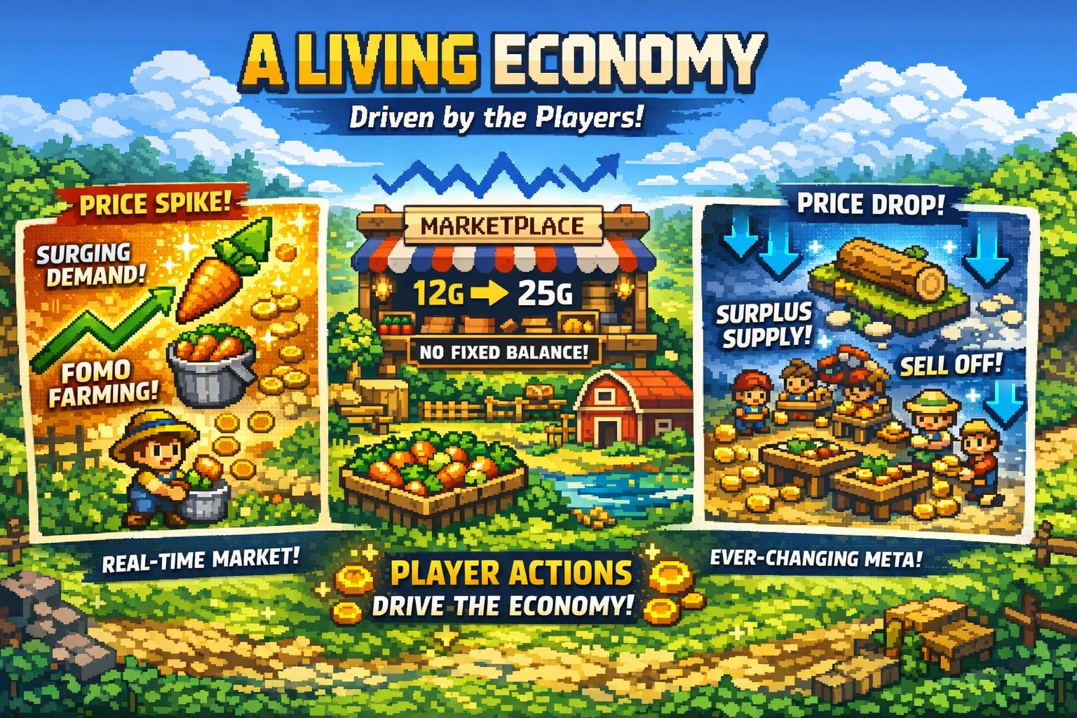 Ngoài ra, vì giá hoàn toàn do player quyết định, nên luôn tồn tại khả năng một nhóm đủ lớn có thể tạo biến động ngắn hạn. Hệ thống không can thiệp nhiều để cân bằng lại ngay, nên những nhịp lệch này gần như là một phần tự nhiên của game.