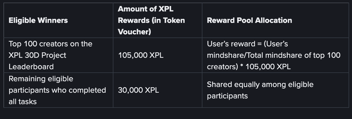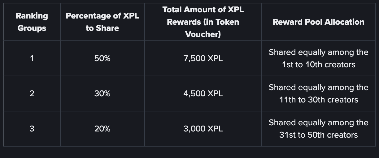 Правообладатели пользователей ранжируются на основе результатов доски лидеров за последние 30 дней на дату завершения активности, чтобы иметь право на пул вознаграждений в 135,000 XPL, согласно таблице ниже.