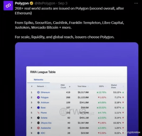 @Polygon занимает лидирующие позиции в сегменте RWA, уступая лишь немногим конкурентам. На платформе функционирует 268 проектов, что свидетельствует о высоком уровне доверия со стороны разработчиков и инвесторов.