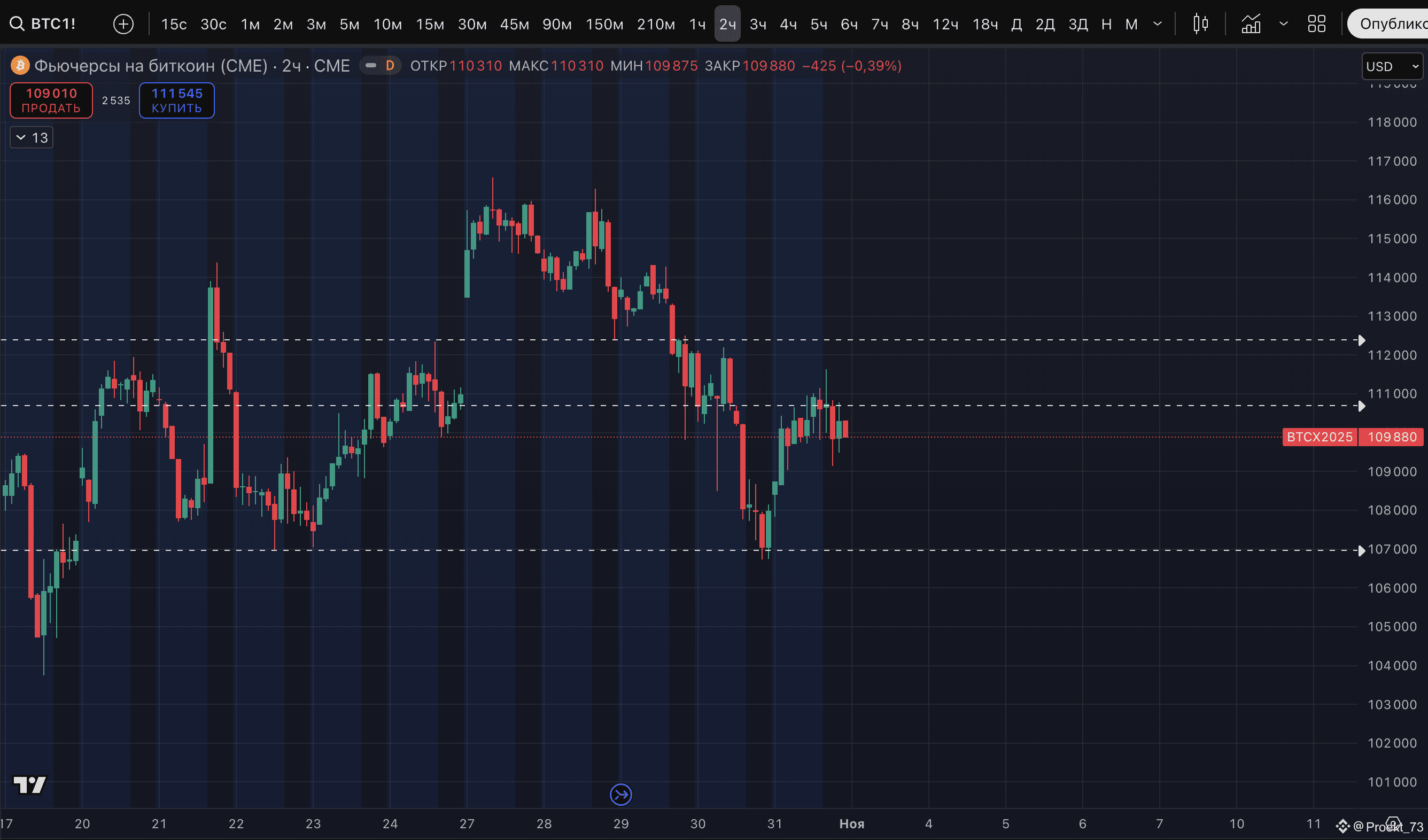 Смущает то, что что на Чикагской товарной бирже (CME) торговля фьючерсами на BTC закончилась в пятницу на 109 880$.
