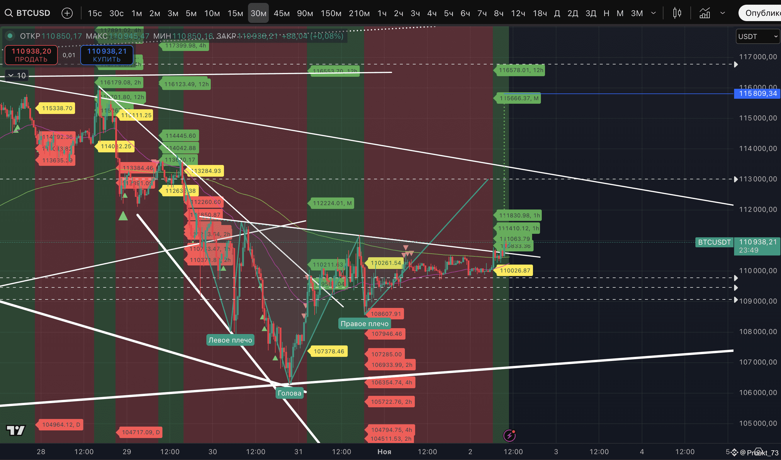 Сегодня имеем переход в устойчивый аптренд на 30-минутном ТФ (крайняя базовая цель 111 063$ почти отработана) и есть пробой "линии шеи". Паттерн сформирован, его полная цель - в районе 115 809$. Дальше вступает в дело вопрос вероятности отработки фигуры.
