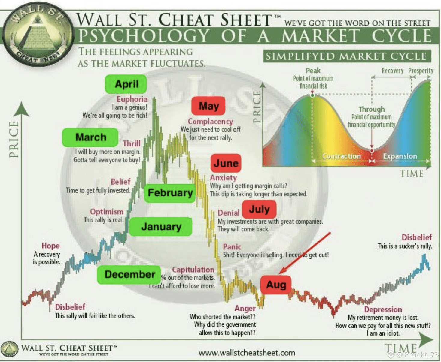 Сама схема известна давно и описывает не цену, а поведение толпы. Она показывает, как инвесторы эмоционально проходят путь от недоверия и надежды - к оптимизму, вере, эйфории, а затем через отрицание, панику и капитуляцию возвращаются в депрессию, после чего цикл повторяется. Это не прогноз и не тайминг, а визуальная модель коллективной психологии. С последовательно сменяющимися настроениями толпы.