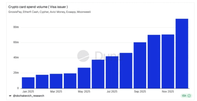 👉 Цифры охватывают криптокарты Visa, связанные с платформами, такими как GnosisPay, EtherFi Cash, Cypher, Avici Money, Exaapp и Moonwell. Картами, связанными с EtherFi, была захвачена значительная часть этого роста, отражая увеличившуюся активность пользователей, конвертирующих свои криптоактивы в повседневные траты через сеть Visa. Ежемесячные объемы рассказывают историю: начиная примерно с середины подросткового возраста в миллионах в январе, траты превысили 80 миллионов долларов к ноябрю.