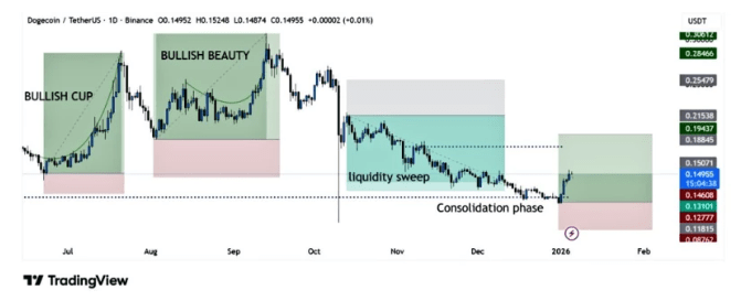 👉 На графике показаны предыдущие бычьи фазы, обозначенные как «Бычья чашка» и «Бычья красота», что отражает волны роста до коррекции и бокового движения в конце 2025 года. DOGE несколько недель торговался в узком диапазоне, прежде чем пробить горизонтальную поддержку и резко отскочить. Такой разворот часто сигнализирует о накоплении, когда умные деньги тихо формируют позиции, пока розничные трейдеры выбиваются из равновесия. В настоящее время DOGE находится чуть ниже сопротивления, и удержание этого уровня может быть решающим для сохранения текущей ситуации.