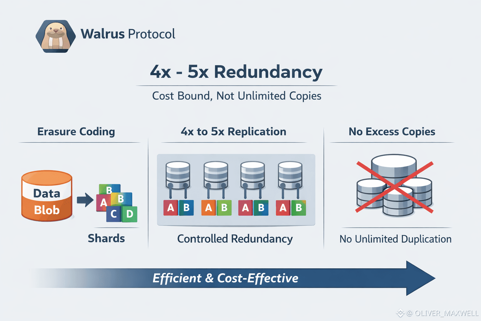 The strategic part is what that ceiling does to the mental model of a blob on Walrus. A blob is not treated as a single object that must be duplicated wholesale across a growing set of nodes, because that path makes cost grow in lockstep with distribution. Walrus instead builds around erasure coding and blob storage so that what spreads across the network are coded pieces whose redundancy is engineered rather than improvised. When the protocol frames redundancy around 4x to 5x, it is implicitly saying that Walrus wants availability and recoverability to come from coding and placement discipline, not from brute-force copying that becomes unaffordable as usage rises.