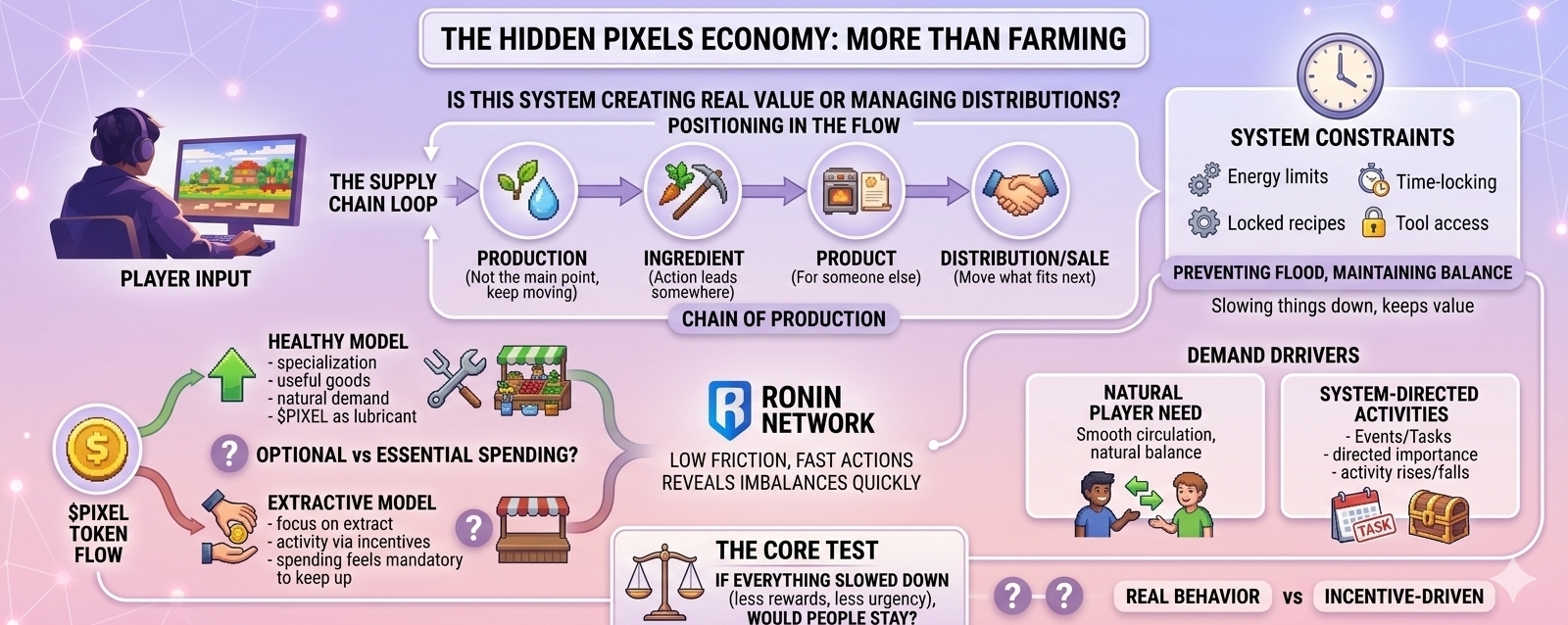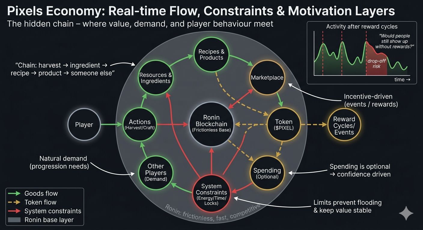 Because underneath all of this, Pixels is trying to maintain a working economy in real time. Not just a game loop, but a system where inputs, outputs, and value all stay connected.