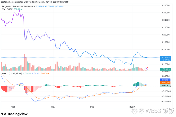 截至目前,根据 CoinMarketCap 数据,狗狗币价格约为 0.14 美元,过去 24 小时小幅回升。