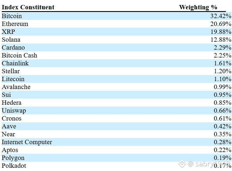 · مكونات المؤشر: يتتبع المؤشر أداء أهم 20 عملة مشفرة حسب القيمة السوقية، باستثناء العملات المستقرة (Stablecoins) والعملات الميمية (Memecoins) وغيرها. حتى 31 ديسمبر 2025، شكلت خمس عملات حوالي 88.15% من وزن المؤشر، وهي: البيتكوين (BTC)، الإيثيريوم (ETH)، الريبل (XRP)، السولانا (SOL)، والكاردانو (ADA)، بينما وزعت النسبة المتبقية على 15 عملة أخرى.