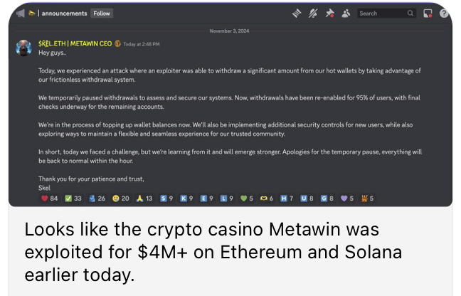The online casino platform MetaWin became the victim of a serious exploit attack on November 3, resulting in damages of approximately 4 million dollars. According to CEO Skel, this amount has been replenished after the attack.