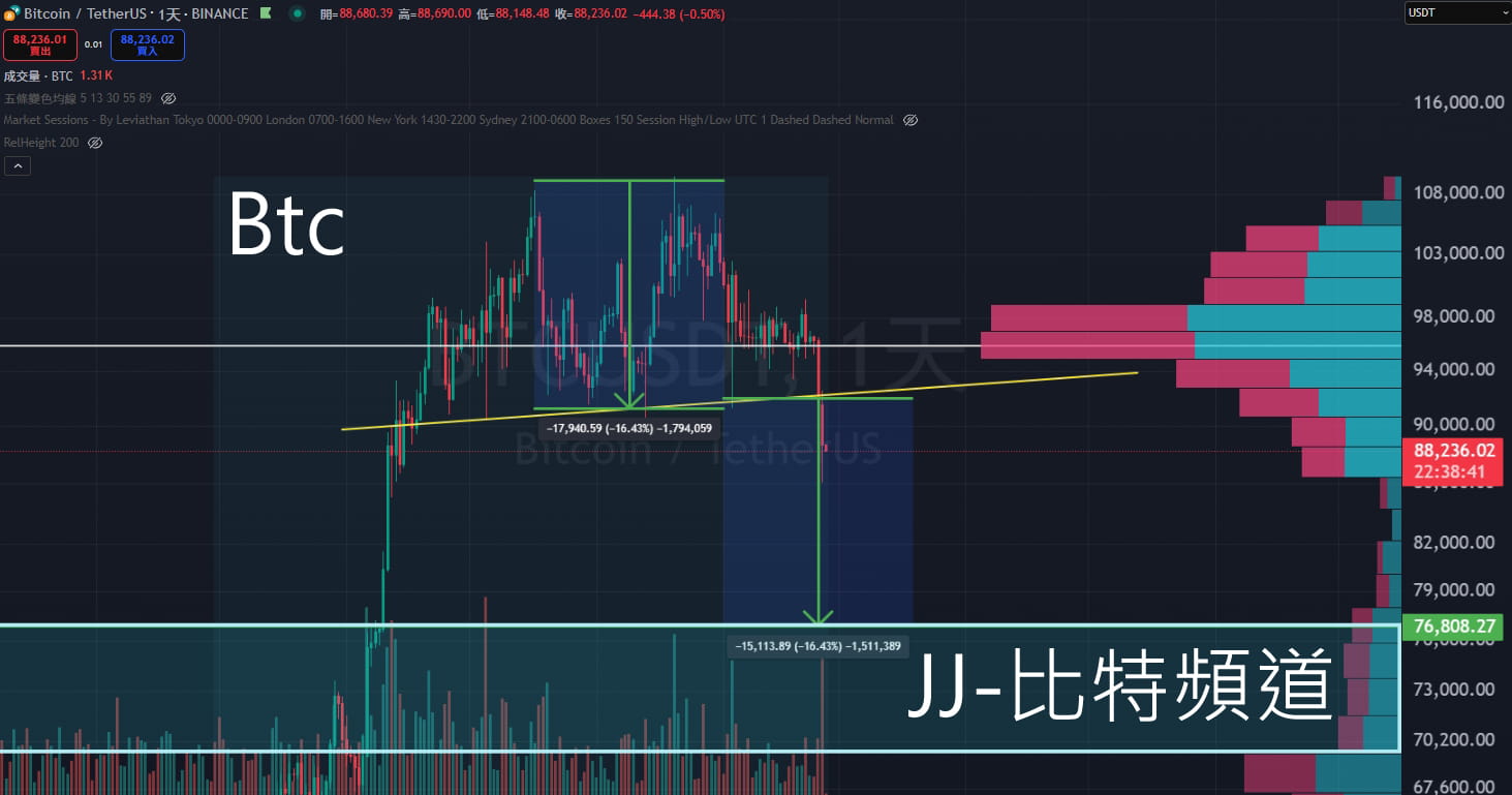 Expected decline range for BTC: Based on the principle of equal amplitude decline of the head and shoulders pattern, the target price should be around 76000. However, considering that the range between 76000 and 70000 is a low-volume vacuum state, the support may be insufficient. Therefore, in operations, when the price falls below 80000 and approaches the range of 76000, we can start to gradually layout. At the same time, we must also anticipate that the price may fall close to 70000 before it stops declining.