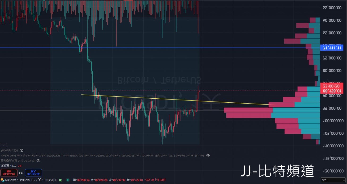 This chart is the inverted chart of BTC. Assuming we restore the BTC normal chart and chase the rise, it is equivalent to shorting in this inverted chart when it declines, which is a counter-trend operation. We just need to prevent a real breakout of the neckline from turning into a false breakout, meaning we should not regain 92500.