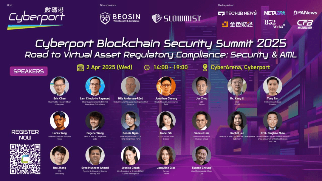 On April 2nd, SlowMist is invited to attend the Cyberport Blockchain Security Summit 2025 hosted by Cyberport in Hong Kong, where we will discuss the security and compliance development of the Web3 ecosystem together with government agencies, law enforcement, and blockchain security experts. Tony Tan, head of the SlowMist Hong Kong community, will deliver a keynote speech titled 'From Code Audit to Real-Time AML: Building A Secure Blockchain Ecosystem,' discussing how to understand and enhance the security of Web3 from pre-event, during-event, and post-event perspectives, along with sharing real case studies on Web3 security practices.