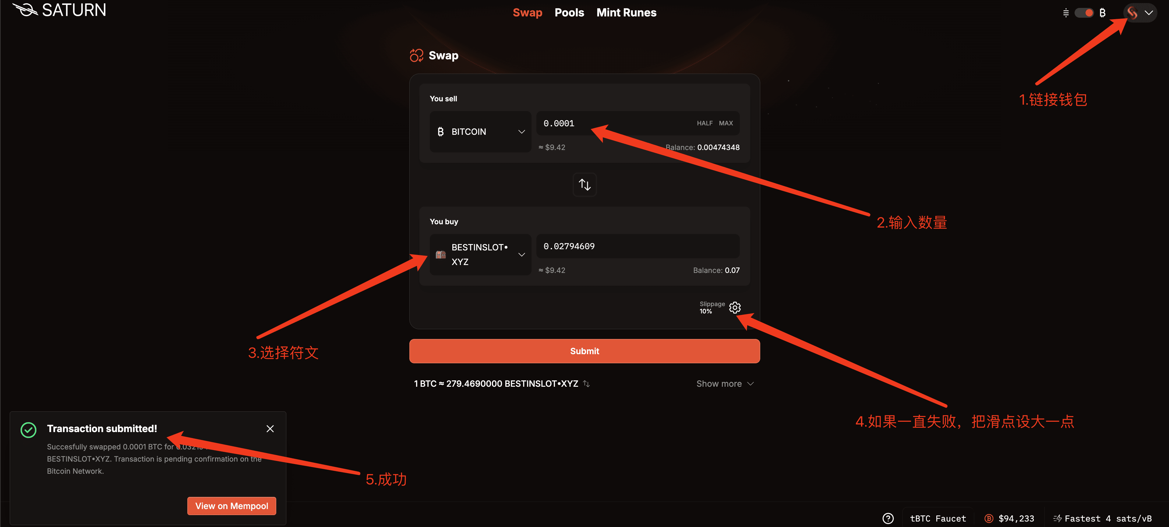 4. Interact @Saturn_btc, experience testing network swap runes and mint runes