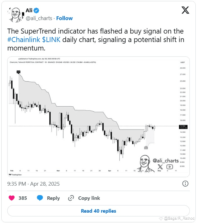 #Chainlink ($LINK ) is trading near $15 after rallying over 50% from April lows, consolidating in a range that has kept traders watching for a potential Chainlink breakout. The SuperTrend indicator recently flashed a buy signal on the daily chart, an early sign of trend reversal. With broader altcoin strength resurfacing, LINK is regaining bullish momentum. This oracle protocol may soon see a decisive move as macroeconomic uncertainty brews. Will Chainlink rally past resistance? That’s the key question as investors weigh its recent performance inside the #LINK consolidation zone.
