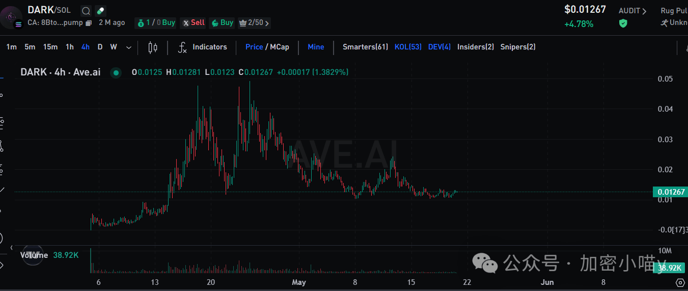 As one of the leaders in the AI sector, although DPCORE has soared recently, there are rotational opportunities in the market. After undergoing deep washing, DARK has stabilized and entered a consolidation phase on the daily chart, ready to break out at any time. Additionally, the sentiment from the Solana hackathon and the project's ongoing 'Jarvis' wallet development injects new expectations and momentum.