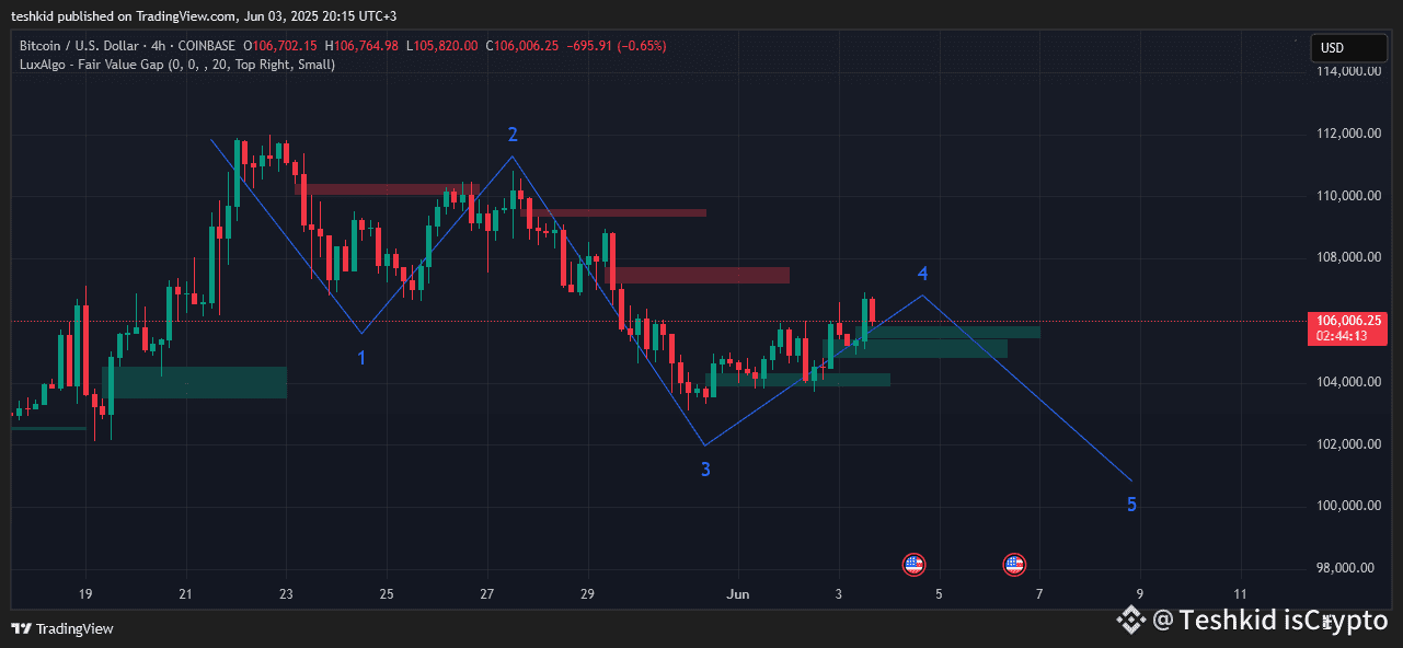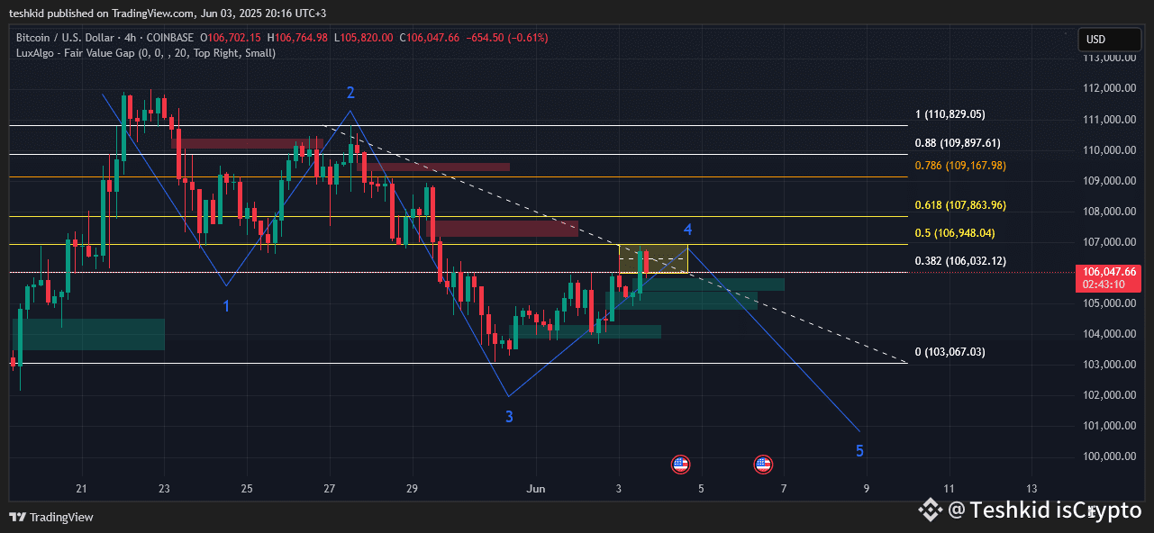 Targets for the wave 4 lie between the fib level 0.382 and 0.5 and that is between $106.9k -$106k. BTC is now rejecting within that area.