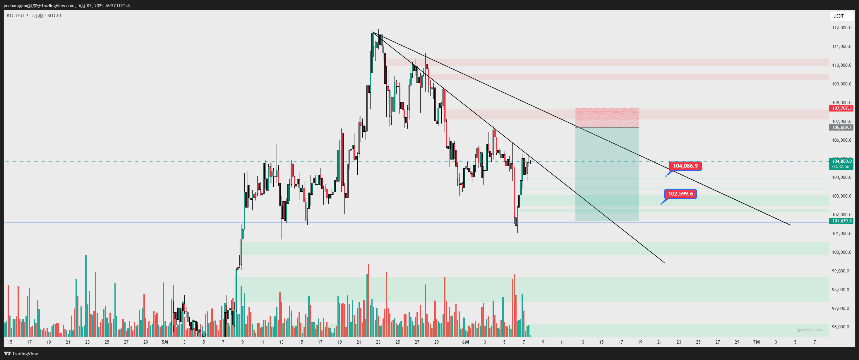 Direction entry range, stop loss target logic based on light position attempt long $102,500-$103,000, stop loss $101,500, target $106,000-$107,500 betting on oversold rebound and Wyckoff breakout precursor, short at high $106,500-$107,000, stop loss $107,800, $104,000-$103,000 capture head and shoulders top pattern downward momentum