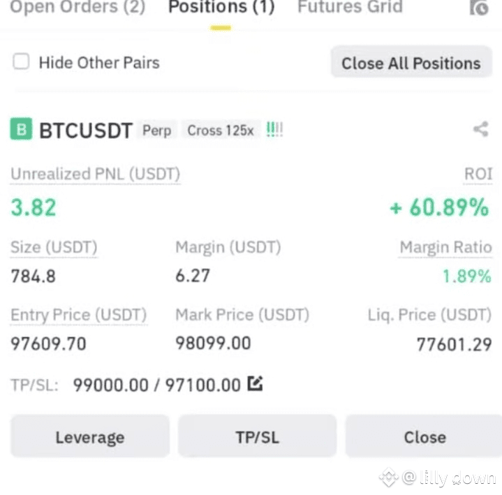 This is a highly leveraged Bitcoin futures trade with a small initial margin. It is currently in profit due to a slight increase in BTC price. However, the high leverage also implies extreme risk—minor adverse price movements can quickly wipe out the margin and lead to liquidation.