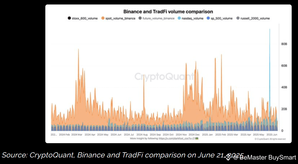 Binance livestreamed new trading data on June 21, 2025, exposing prominent differences between the cryptocurrency and conventional financial markets. Binance analyst Darkfost compared daily spot and futures volumes from Binance with traditional equity markets like the Nasdaq. The analysis highlighted clear volume divergence. It showed that even during macro uncertainty, Binance remains a global liquidity hub. This matters because it reflects evolving crypto investor behavior and capital flows amid changing interest rate expectations and regulatory tensions.