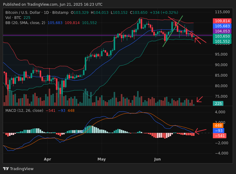 Currently, the price of Bitcoin is below that zone (104k), under a bearish diagonal (which it could not overcome), with less volume than the previous day, and the MACD moving average is entering a bearish zone (below the histogram) with a red bar despite today being a bullish candle (daily timeframe).