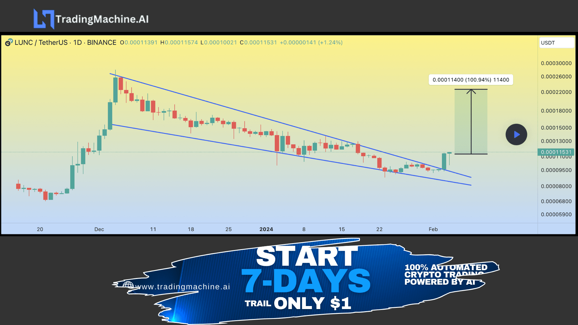 Picture this: a cryptocurrency rocket ready to blast off, fueled by optimism and backed by solid fundamentals! Our team of esteemed Trading Machine AI experts has been on high alert, spotting LUNC as a beacon of potential in the recent market resurgence. According to our analysis, LUNC has been on a meteoric rise over the past three months, with a sturdy support level hovering around $0.00007. 📊✨