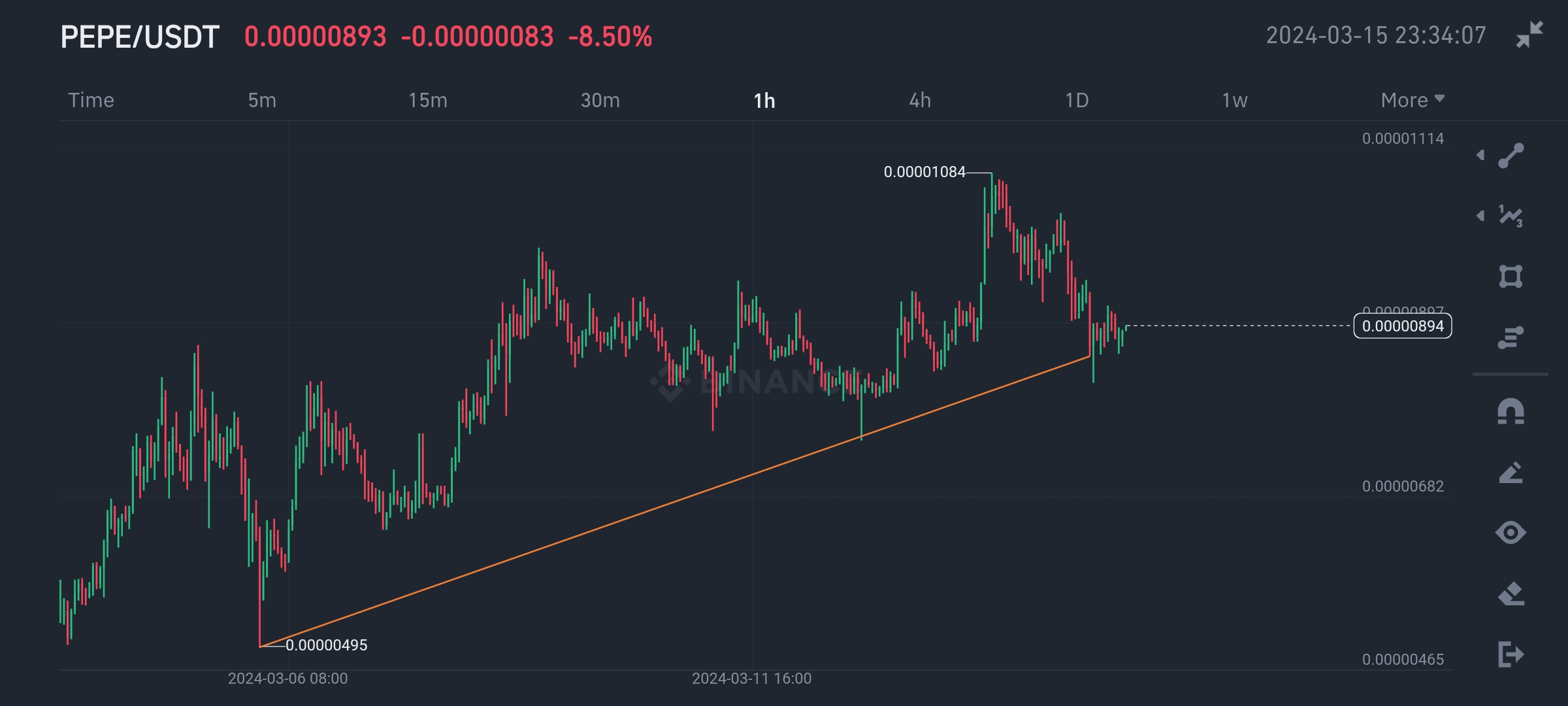 PEPE is a well known meme coin making some major moves in the market despite seeing a decline from the ATH .010 to .890 we do still see a upward trend line .