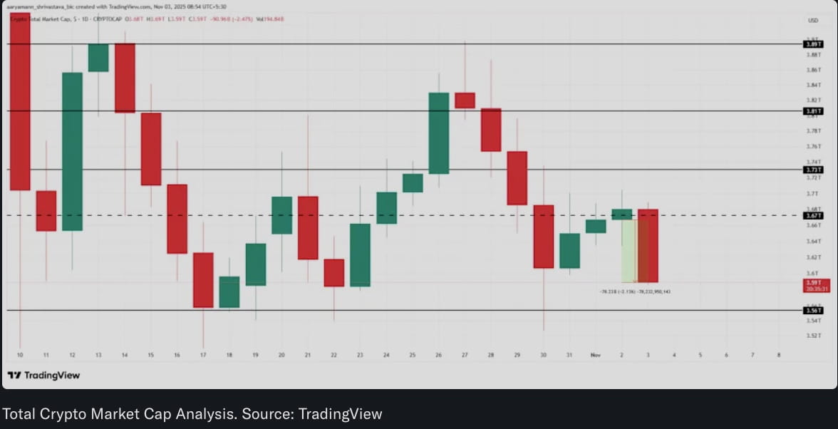 The total crypto market cap dropped 3.1% to $3.69 trillion on Nov. 3, 2025.