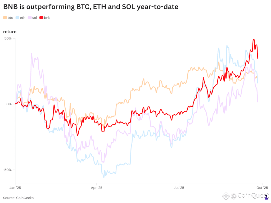 And if you compare its chart to BTC, ETH and SOL, it’s clear that at least until recently, BNB had kept up momentum where others have stalled.