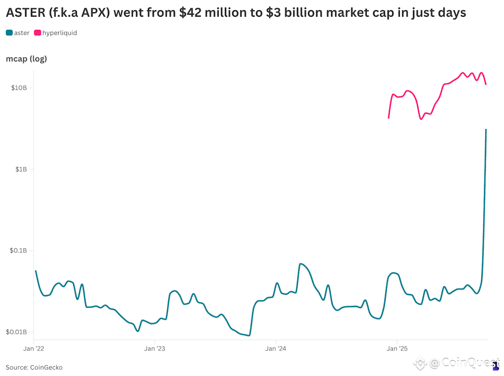 The chart above stitches the APX token’s original trading history with the new ASTER token, and plots it against Hyperliquid’s HYPE, in log view.