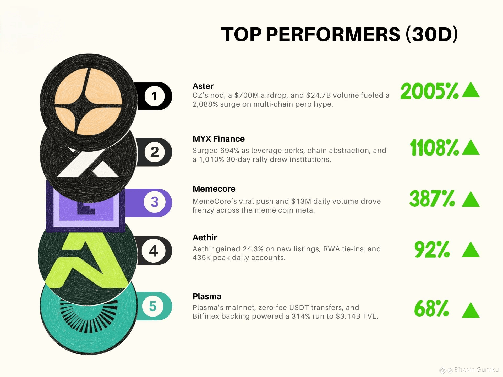 ASTER took the crown with an astronomical 2,005% surge. Yes, you read that right - over two thousand percent! Imagine turning $100 into $2,000 in just thirty days. That's not just profit, that's life-changing money.