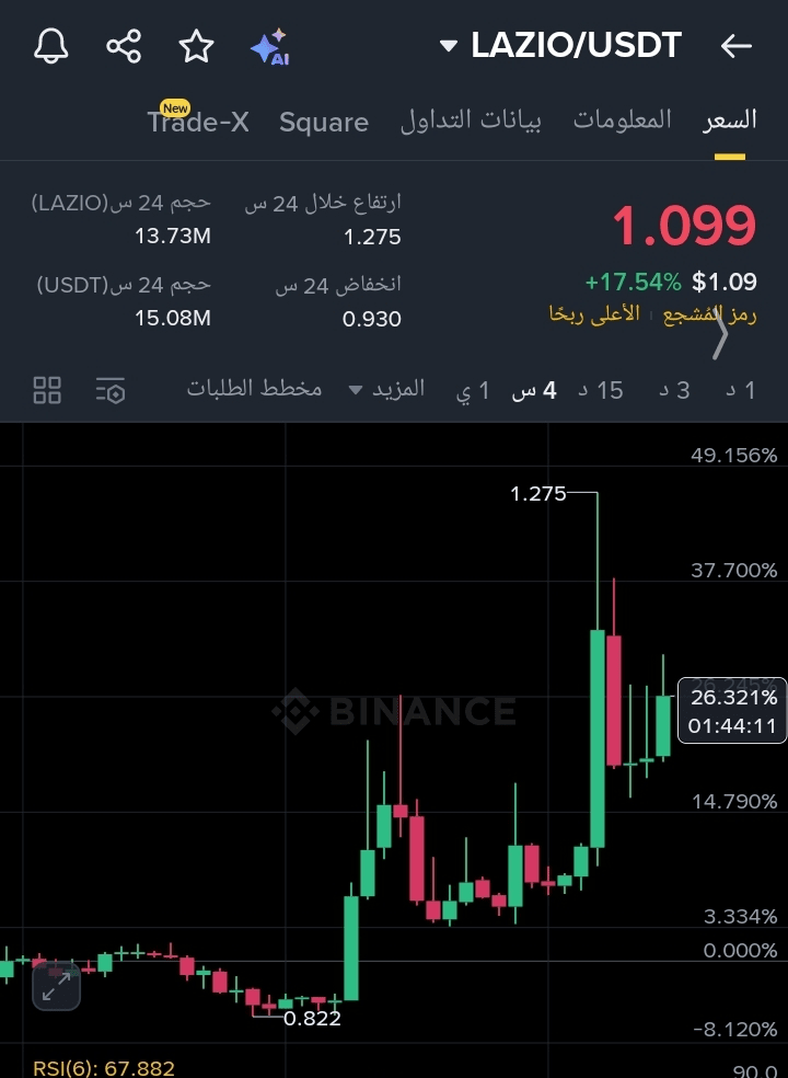 شهد زوج LAZIO/USDT تحركًا ملحوظًا خلال الساعات الـ24 الماضية، مع تقلبات كبيرة في السيولة والاتجاه. بدأت العملة جلسة التداول عند مستوى 0.956 USDT، ثم شهدت قفزة حادة في السعر وصلت إلى ذروة عند 1.275 USDT خلال فترة الساعة 15:00 (توقيت 2025-09-29)، مصحوبة بحجم تداول مرتفع جدًا بلغ أكثر من 186 ألف وحدة تداول، مما يشير إلى نشاط شرائي قوي.