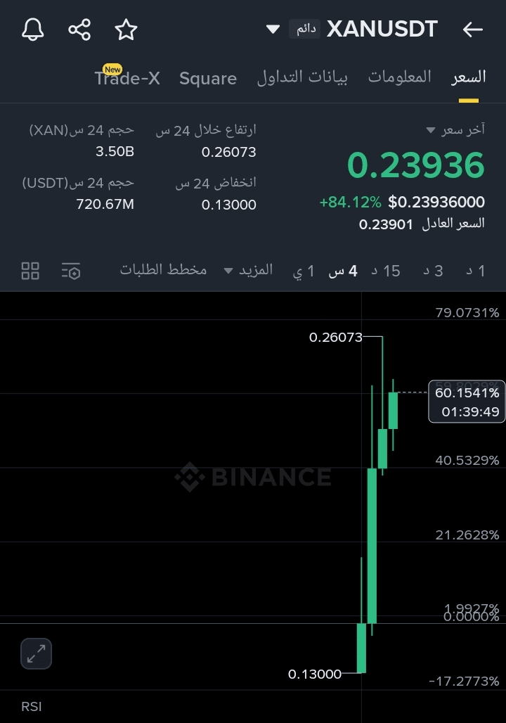 حتى الآن، لا توجد إشارات واضحة على انهيار الزخم الصاعد في رسم XAN البياني. السعر واصل الارتفاع من 0.0500 إلى ما يقارب 0.2420، مع شموع إغلاق متتالية أعلى من السابقة، وهو نمط يدل على استمرار السيطرة من المشترين.