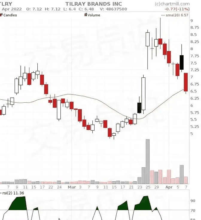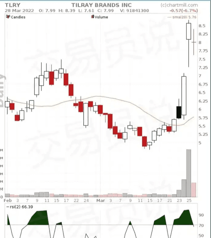 在TLRY的图表中,RSI(2)在2022年3月28日交易日后略低于70。
