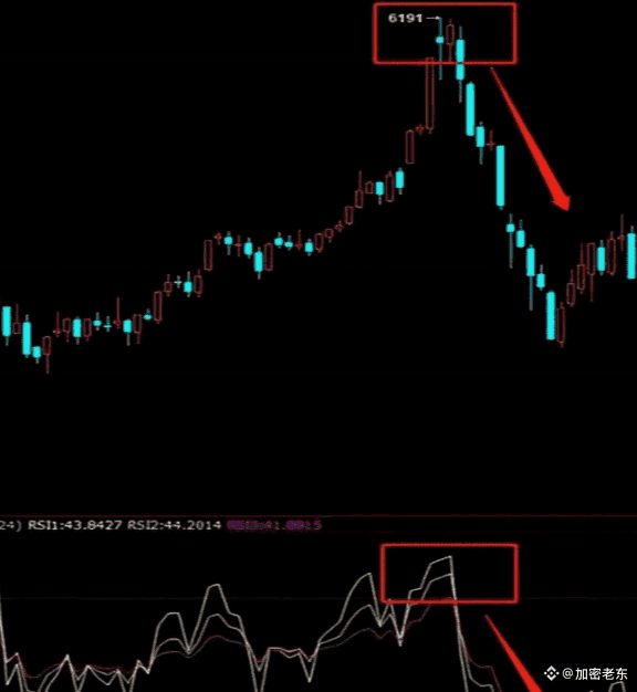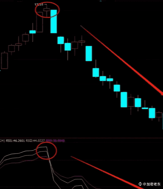 当短期RSI线在高位向下突破长期RSI线时,形成死叉,表明价格下跌可能性很大,这是一个卖出信号。要注意的是当死叉发生在80以上比较有效,也就是RSI既出现