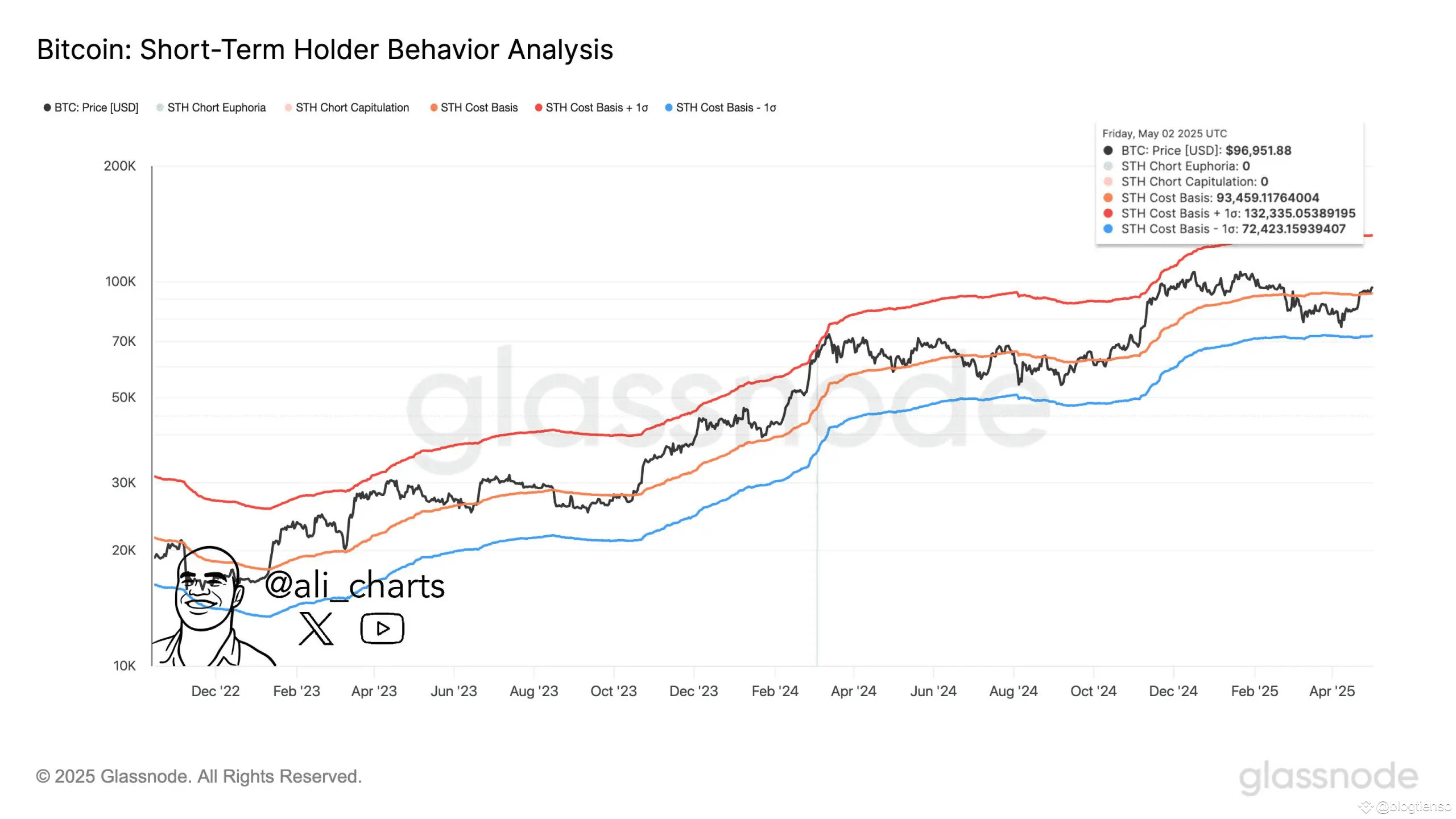 Cơ sở chi phí nắm giữ ngắn hạn là giá mua trung bình của BTC do các nhà đầu tư nắm giữ trong thời gian dưới 155 ngày. Đây là một số liệu phổ biến trên chuỗi phản ánh tâm lý thị trường ngắn hạn và hoạt động như một đường hỗ trợ/kháng cự động.