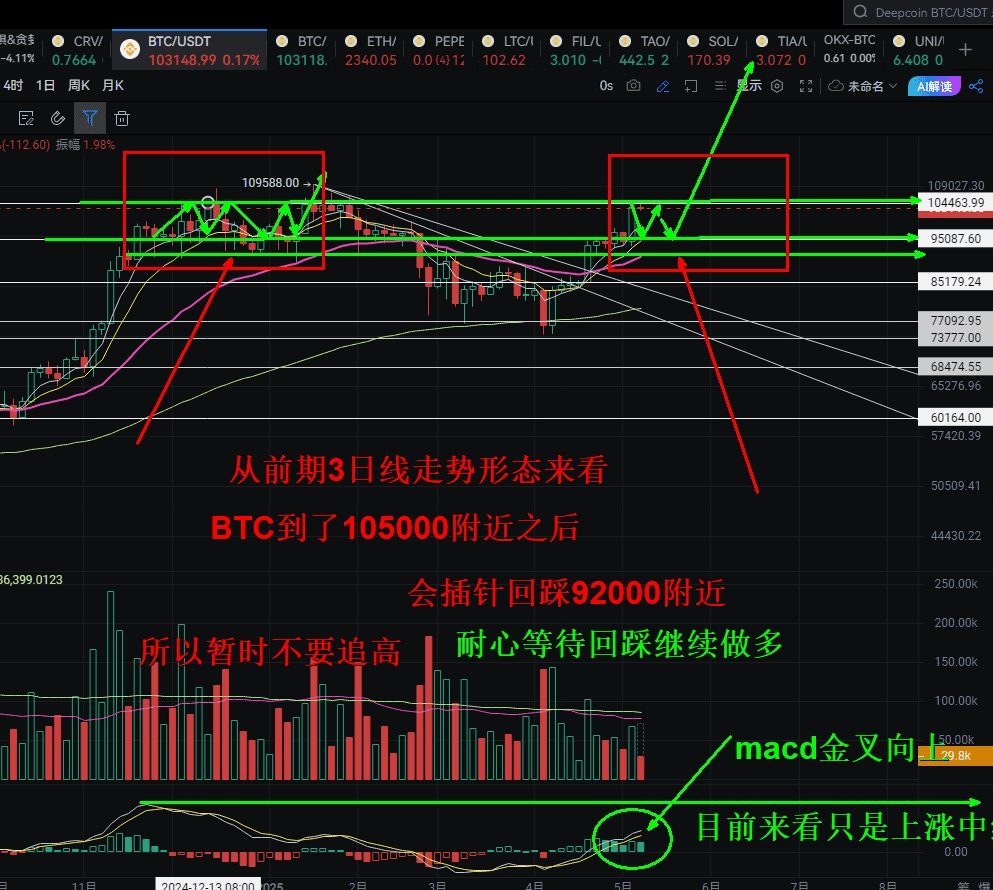 Từ mô hình biểu đồ ba ngày, chúng ta có thể thấy rằng sau khi BTC tăng lên khoảng 105.000, nó đã liên tục điều chỉnh về 92.000. Một sự điều chỉnh là chắc chắn, vì vậy vào thời điểm này, hãy tránh việc đuổi theo đỉnh cao. Không chắc chắn khi nào nó sẽ giảm xuống. Hãy kiên nhẫn chờ đợi sự điều chỉnh và tiếp tục mua vào. Giao cắt vàng của MACD đang di chuyển lên, và từ mô hình, chu kỳ lớn hiện tại vẫn là một sự tiếp tục của xu hướng tăng, và thị trường sẽ tiếp tục tăng.