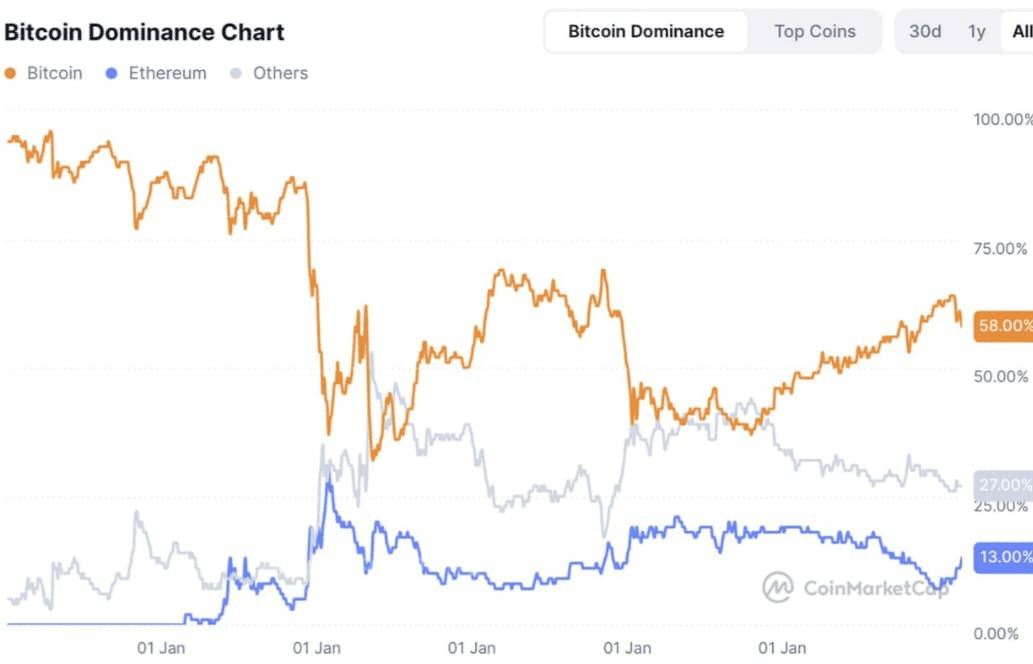 🧐 Lần đầu tiên sau một thời gian dài, sự thống trị của Bitcoin đang giảm và sự thống trị của Ethereum đang tăng. Chúng tôi cũng nhận thấy rằng sự thống trị của các altcoin khác đang cho thấy ít hoặc không có sự tăng trưởng.