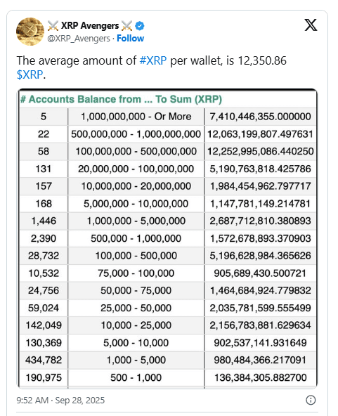 Bài viết, được xuất bản vào ngày 28 tháng 9, có hình ảnh hiển thị số lượng tài khoản trên các khoảng cân bằng XRP khác nhau. Nó báo cáo rằng số lượng trung bình XRP được giữ trong mỗi ví là “12,350.86 $XRP .”
