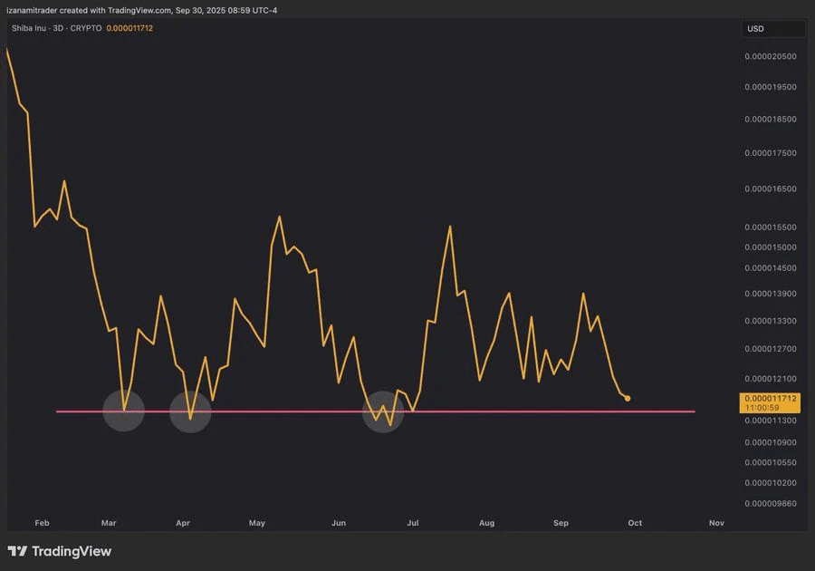 Khi tháng Mười năm 2025 bắt đầu, token đã tăng 0.56% trong vài giờ đầu tiên của tháng. Liệu sự khởi đầu khiêm tốn này có trở thành một đợt tăng giá rộng lớn hơn hay không còn phụ thuộc nhiều vào sự tương tác của SHIB với khu vực hỗ trợ của nó.
