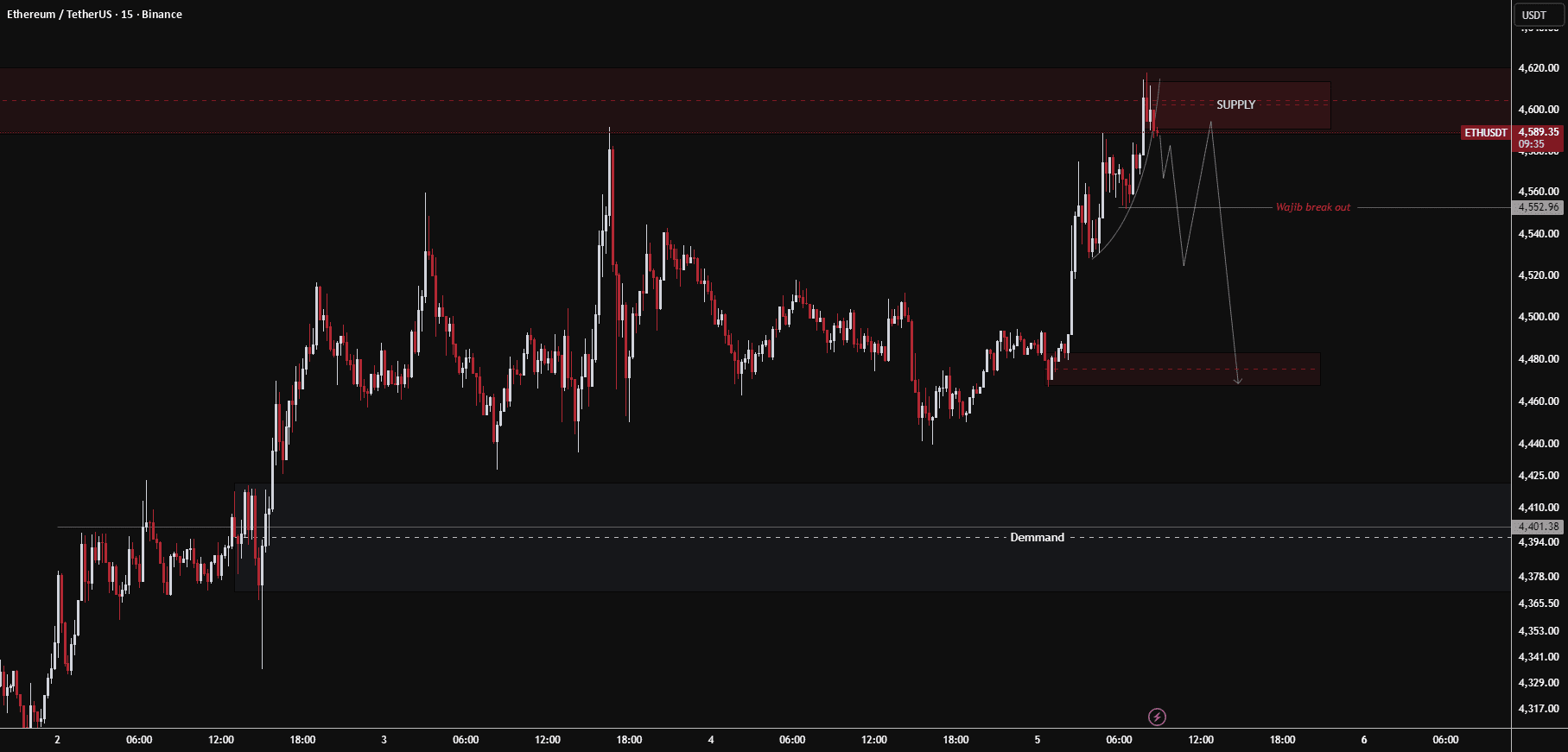 ETH đang phản ứng trong vùng cung 4 580 – 4 620 USDT, hoạt động như một khu vực phân phối nhỏ. Động thái tăng mạnh đã mất đà khi giá gặp phải sự từ chối với những cái bấc dài xung quanh khu vực này — một dấu hiệu cho việc chốt lời từ những người mua ngắn hạn và khả năng vào lệnh từ những người bán đang chờ xác nhận về một sự điều chỉnh.