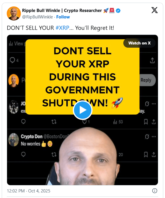 Ripple Bull Winkle cũng gợi ý rằng các tham gia thị trường có thể đang nhìn sai hướng. Anh ấy chỉ ra rằng trong khi "mọi người đang hoảng loạn về một cuộc ngừng hoạt động của chính phủ Hoa Kỳ," quy trình xem xét của SEC đối với các ETF vẫn đang tiến triển. Anh ấy gợi ý rằng sự tương phản này tạo ra một tình huống bất thường nơi các quyết định tài chính lớn tiến triển một cách yên lặng.
