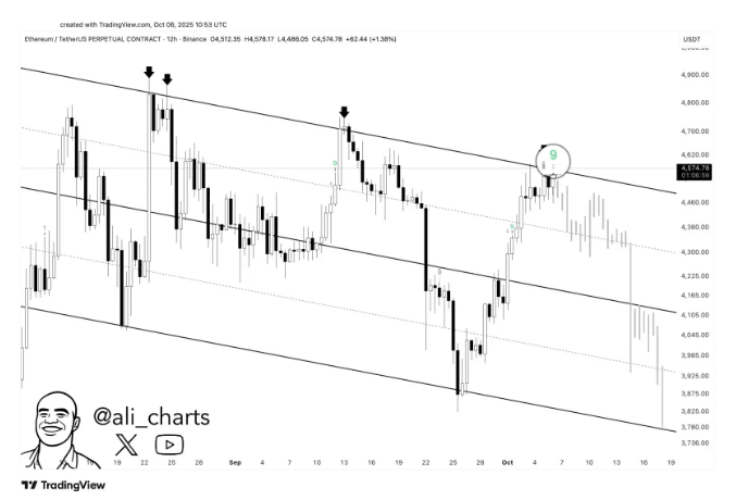 Nhà phân tích thị trường Ali gần đây đã chỉ ra rằng TD Sequential của Ethereum vừa kích hoạt tín hiệu bán tại khu vực kháng cự quan trọng $4,600. Lịch sử cho thấy, các tín hiệu tương tự đã đánh dấu các đỉnh địa phương trước khi các đợt điều chỉnh xảy ra.