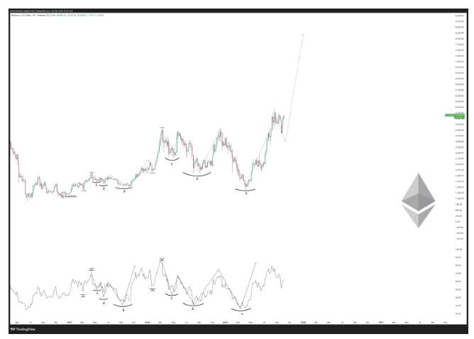 Những bình luận gần đây về thị trường, bao gồm các hiểu biết từ nhà giao dịch Javon MARKS, cho thấy Ethereum dường như đã sẵn sàng để bước vào một giai đoạn tăng giá khác. Biểu đồ hiện tại tiết lộ các mẫu hình khuyến khích. Ethereum đã hình thành nhiều vùng tích lũy tròn, mỗi vùng đều được theo sau bởi những động thái tăng mạnh, cho thấy các nhà đầu tư đang từ từ xây dựng vị thế trước khi đẩy giá lên cao hơn. Cấu trúc thị trường thể hiện các đáy cao nhất liên tục, xác nhận rằng áp lực mua vẫn giữ nguyên.