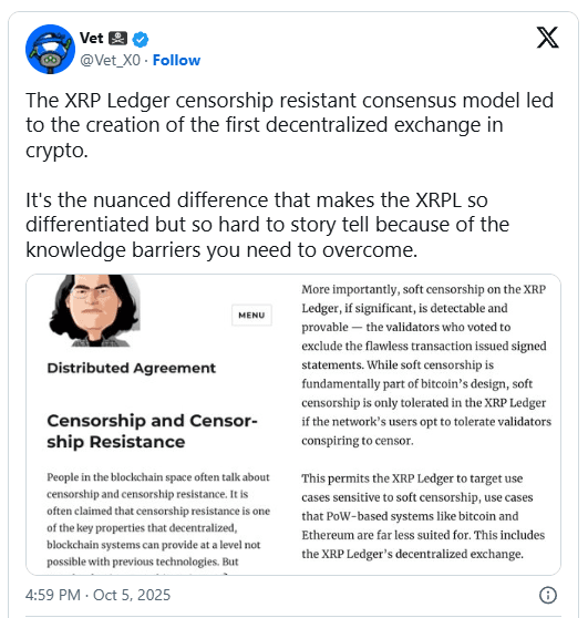 Bằng cách tham chiếu đến bài thảo luận trước đó của David Schwartz, VET khẳng định rằng mô hình đồng thuận của XRP Ledger không chỉ liên quan đến hiệu quả hay tốc độ mà còn về tính minh bạch trong quản trị và khả năng phơi bày bất kỳ nỗ lực nào nhằm thao túng. Đặc điểm này đã cho phép XRP Ledger duy trì một trong những sàn giao dịch phi tập trung đầu tiên và hoạt động hiệu quả nhất trong ngành công nghiệp crypto.